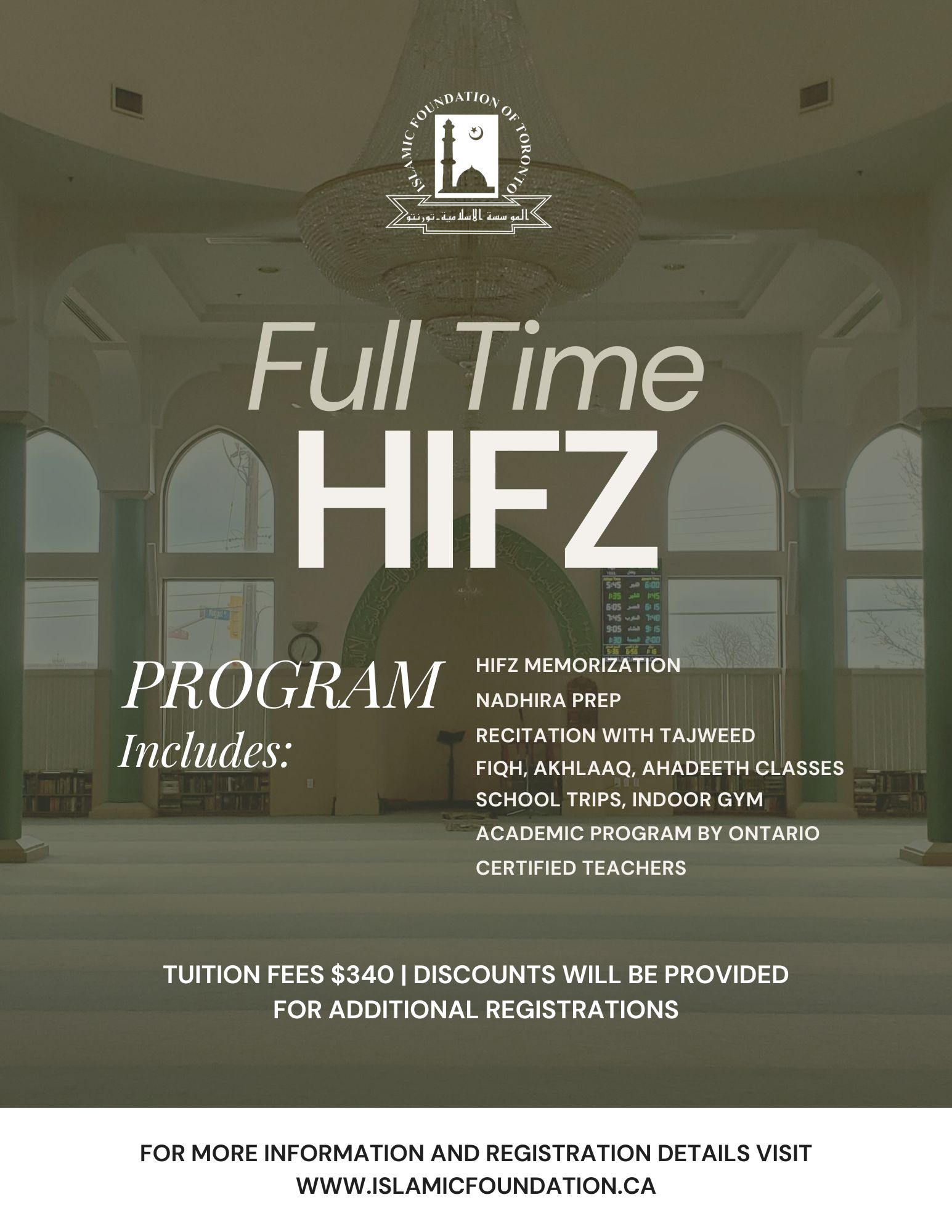 A. There are multiple ways to keep informed of upcoming events. Emails will be sent out periodically with any important notices or reminders. Notices and reminders will also be posted in the Full-Time Hifz section on the Islamic Foundation website, insha-Allah (www.islamicfoundation.ca).
